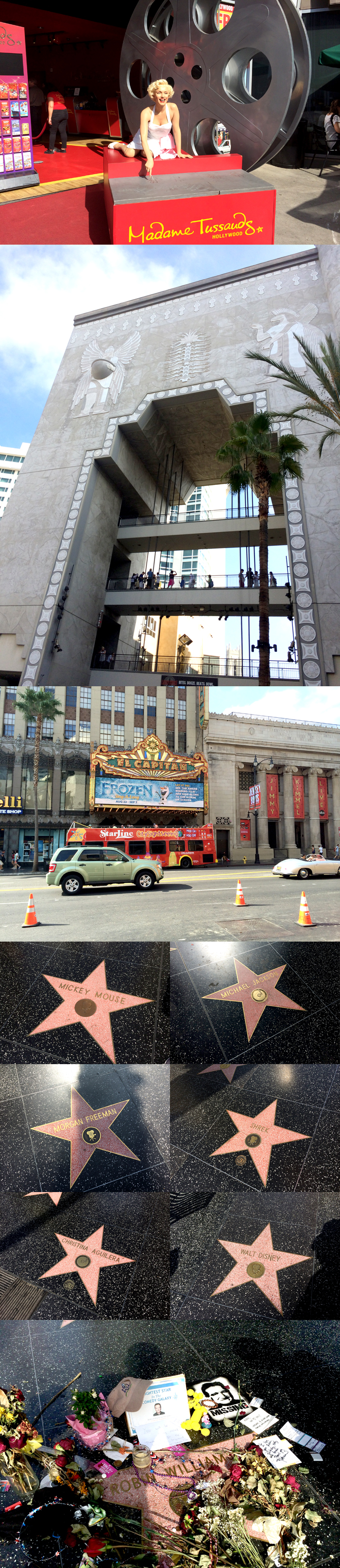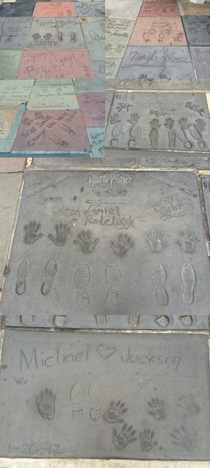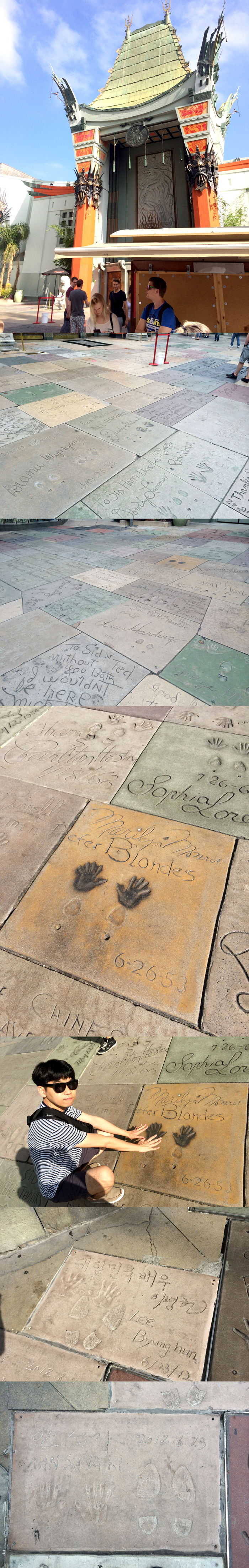 13 9월, 2014 아침 일찍 헐리우드 거리로 나섰다. 호텔에서 걸어갈 정도로 가까운 곳에 위치해 있었다. 명예의 거리가 제일 먼저 보였다. 특히, 얼마전 타계한 로빈 윌리엄스의 애도물결이 눈에 들어왔고, 한순간 숙연해졌다. 미래의 스타를 위해 비어있는 블록. 붙이고싶은 충동이 몰려왔다. >< 명예의 거리를 걷다 보면 ‘맨스 차이니즈 극장’이 보인다. 헐리우드 배우들의 핸드프린팅으로 널리 알려진 곳이다. 마릴린 먼로, 마이클 잭슨등 전설적인 스타들의 핸드프린팅이 광장을 가득 채웠다. 배우 이병헌과 안성기가 핸드프린팅을 했다는 얘기를 들은 것 같은데… 정말 이곳에 있었다. (와우~) 톰행크스, 윌스미스, 해리포터도 보이고.. 마이클 잭슨도…2012??? (검색해보니 마이클잭슨의 유품으로 찍었다고 함.)
