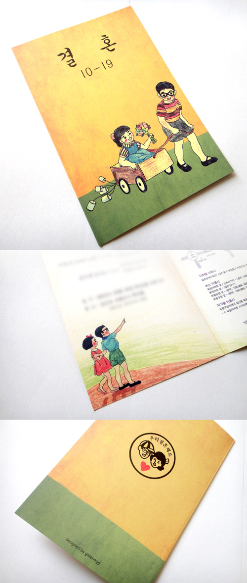 15 3월, 2014 작년 10월에 결혼한 여동생의 청첩장. 디자인부터 제작까지 모두 맡아서 진행했다. 옛날교과서 컨셉으로 진행했는데, 초기에 아이디어가 잘 잡혀서 술술 풀렸던 기억이난다. 결과물이 좋게나왔고, 반응도 좋아서 나름 뿌듯한 프로젝트였다. 여동생이 현재 임신중이여서 고생이 많을텐데, 몸 건강하고 행복하길 바랄뿐…^_^