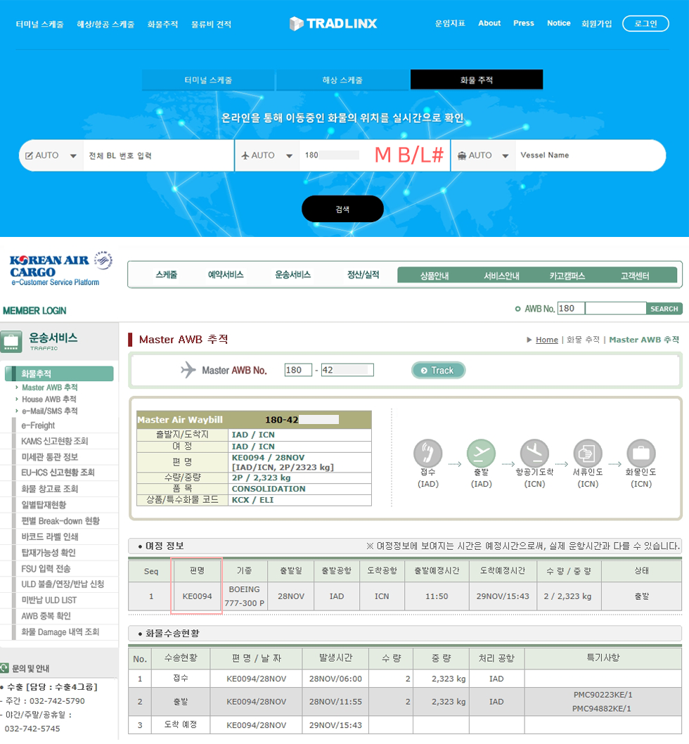 화물추적을 제공하는 TRADLINX에서 Air Waybill 칸에 MBL을 입력하고 검색하면 내 화물이 어떤 비행기에 타고 있는지 알 수가 있다.
