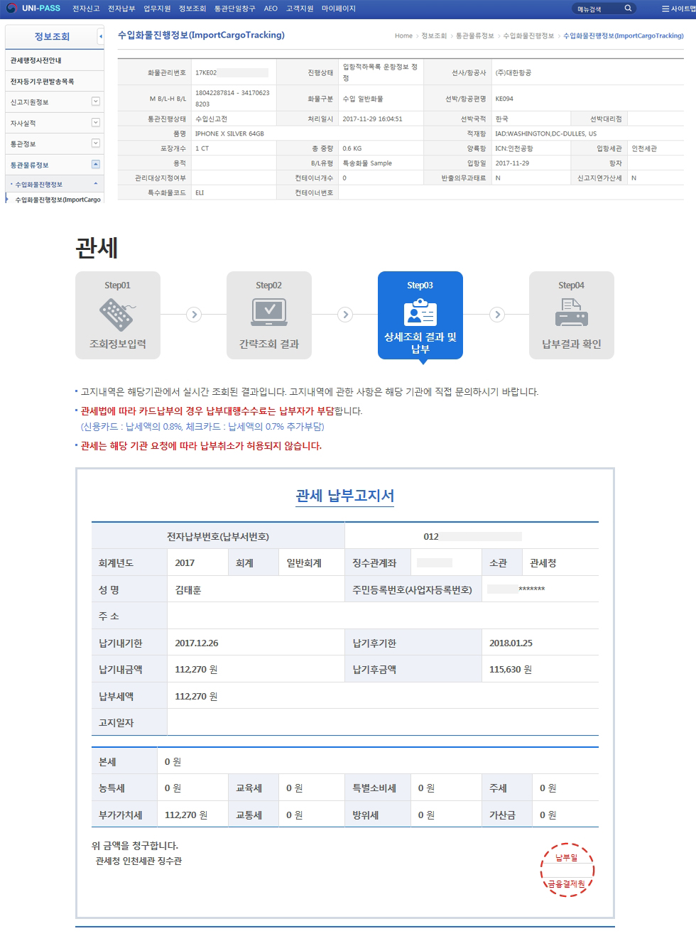 아이폰 경우 $200가 넘기 때문에 제품의 10%, 부가세를 내야만 통관이 가능하다. (일반통관)