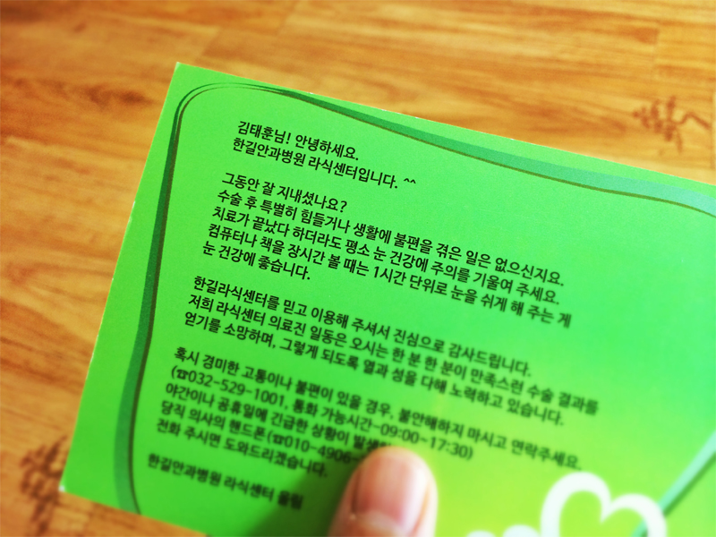 23 3월, 2014 안과에서 안부를 묻는 엽서 한 장이 도착했다. 6개월전에 라섹을 했는데, 수술 후 불편이 없었냐는 뭐 이런 내용. 이럴 때 시간 참 빠르게 지나간다는 걸 느낀다. 라섹 한지 얼마 안 된 것 같은데 벌써 반년이 지났다니.. 오랜만에 전에 썼던 안경도 꺼내봤다. (다시는 쓰고싶지 않는 ㅋ) 현재는 시력도 잘나오고 불편 없이 생활하고 있다. (1.2정도) 혹시, 한길안과에서 라섹(라식)을 계획하고 있다면, 날 이용해서 ‘추천인 할인’을 받으시길. (10만원 할인)